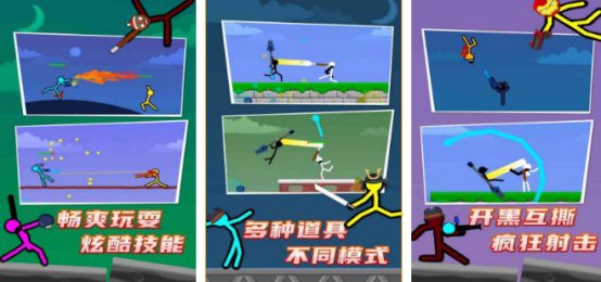 足够简约的火柴人风格,每种角色都有适合自己的独立武器和不同的特色招式,提供较为丰富的模式,满足更多玩家的需求与喜好,支持1v1单挑,以及双人合作和多人乱斗,可邀请好友共同参与到竞技场当中,不断攀升天梯排名,游戏也强调生存模式,需要精准的操作,并完成战术策略,才能够灵活应用角色技能。