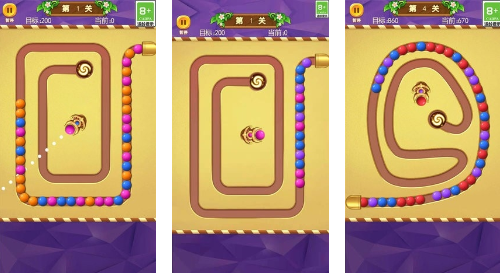 关卡设计比较丰富,每一关出现的小球都是各不相同的,而且小球弹出的速度会随着进程不断加快。游戏开局之后,会有各色小球陆续出现,等小球进入轨道,玩家需要精准射击,把相同颜色的小球凑到一起,只要集齐三个,及以上同色小球就会立刻消除,同时玩家就能得到相应的分数。这个过程很考验玩家的反应速度,需要尽快完成消除操作,绝不能让小球在轨道空间里越积越多。