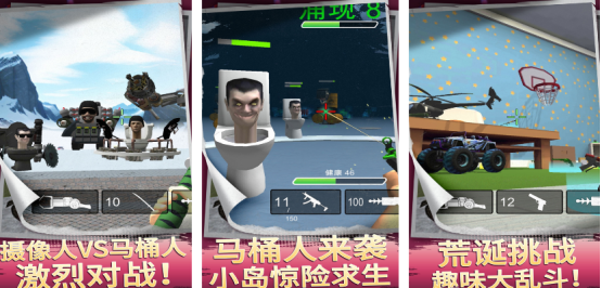 以沙盒生存为核心机制,置身于环境恶劣的孤岛之中,面对严寒冬季带来的极端天气,必须时刻维持生命值。探索岛屿收集关键线索,同时迎战神秘的马桶人敌人。武器系统丰富多样,可在战斗中灵活选择并切换装备,开启充满挑战的大乱斗模式,体验紧张刺激的求生冒险。