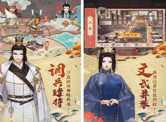 在游戏属于策略养成类型的,身为皇帝的你,在这里面可通过挑选武将、文臣,想办法的提升国力。通过亲自处理朝政以及融入各诸多的趣味性的玩法,帮助你成为见证每个盛世王朝的发展过程。包括在上朝有时候,也通过一种真实模拟方式,帮助你有身临其境当皇帝的体验。更融入了后宫选妃以及征战四方等,与皇帝有关的事情。