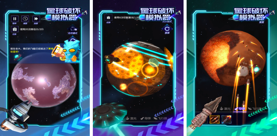 星球破坏,解压感十足!玩家穿越星际中,以第一视角进入到开拓的宇宙空间站,目之所及皆是高科技,专业3d技术,打造上百个耀眼星球,而作为宇宙破患者的你,开启疯狂“毁坏”模式,超逼真的背景音效,随着每一次破坏,迸发出的特效,三种主题破坏模式,让体验近乎疯狂的星际破坏之旅。