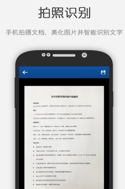 拥有强大的文字提取能力和云端同步功能,在日常生活与工作中均有广泛应用。多年来持续优化用户体验,被誉为“手机上的打印机”。只需拍摄纸质文档,即可快速获取识别结果,支持多语种及局部区域识别,重要图片与视频也可安全存储,防止数据丢失。