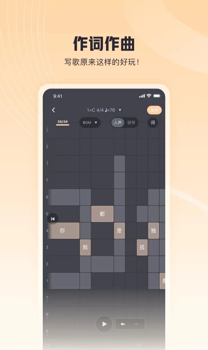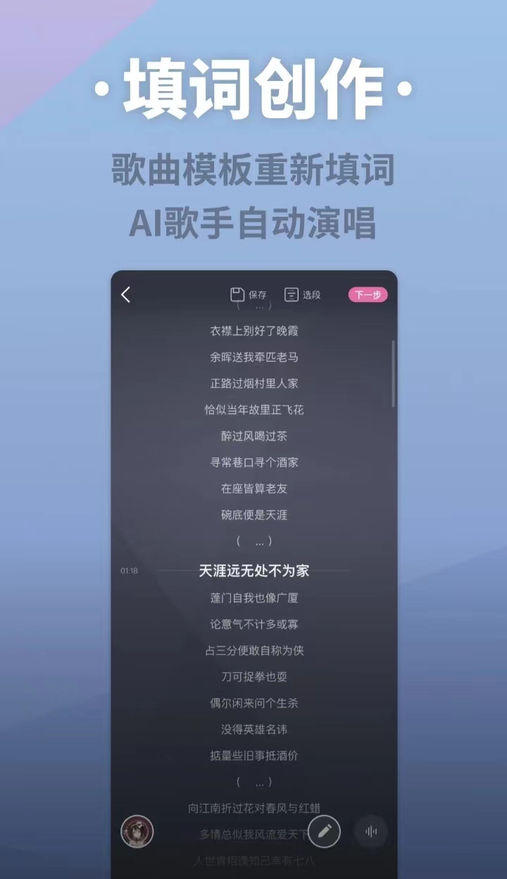 具有人人都可写歌和歌手召唤两大功能的app。用户只需将自己的k歌作品上传平台,就可召唤到与用户声音相同的歌手,他将为你翻唱各类歌曲,与他共同成长。即便是完全不懂音乐知识的朋友,也能在ai的帮助下快速进行写歌的学习,让你自主填写歌词,一键生成专属于你的主题曲。