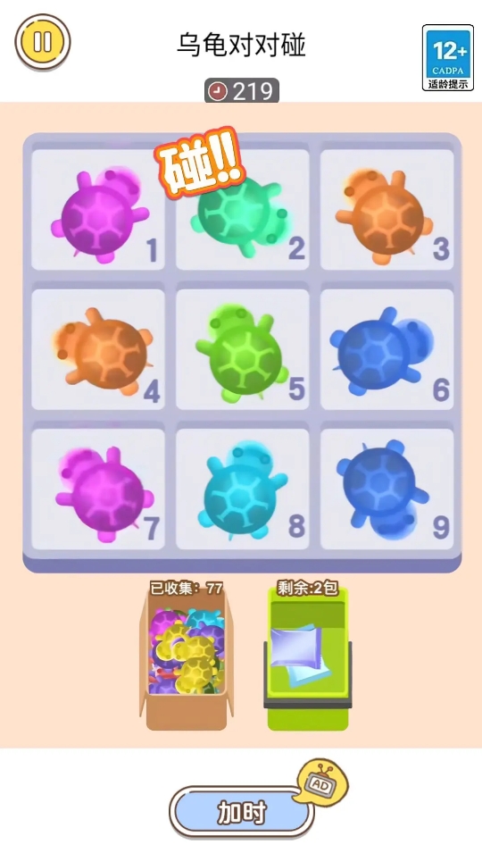 可爱的小乌龟们正在这款作品里等各位帮它们完成配对,各位需要像开盲盒一样翻开九宫格内不同的卡片,只要能翻出同样颜色的小乌龟,就能令它们完成配对。若没有可配队的小乌龟时,还能通过拆包让九宫格内上架新的,继续自己的配对大业。等关卡内的小乌龟卡包都拆完,且所有的小乌龟都完成了配对后,便能再开新的一关接着游玩。而且此作不光能体验对对碰,还有众多休闲消除模式可游玩。