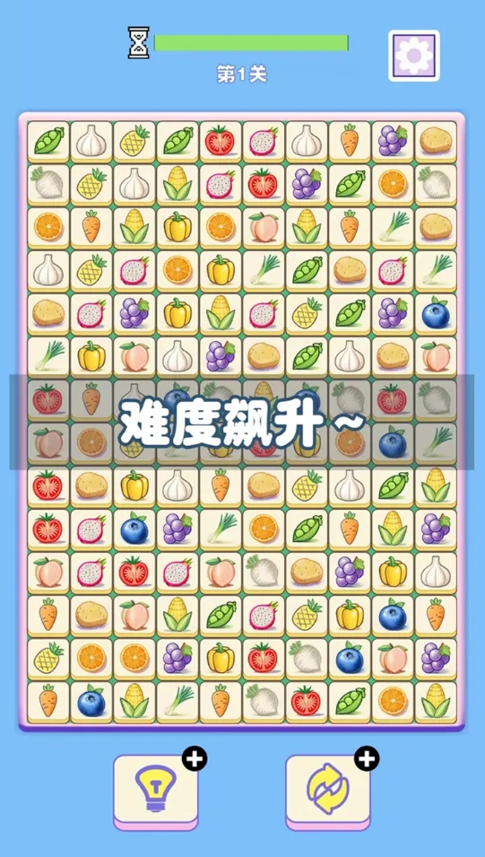 选取相同的蔬菜,只要它们之间可通过三段以下的直线连接到一起,即可让两张蔬菜牌一并消除,待关卡中的蔬菜牌被全部消除后,便可去往更难的关卡继续自己的对对碰挑战。此作前几关没有太多的特殊规则,但后续的关卡会出现蔬菜牌向中间、四周缩进、重叠到一起的机制,也令它的挑战难度会直线上升,当然人们也能使用提示来寻找还有哪些可直接消除的蔬菜牌,若都没有还可重制蔬菜牌的摆放顺序。