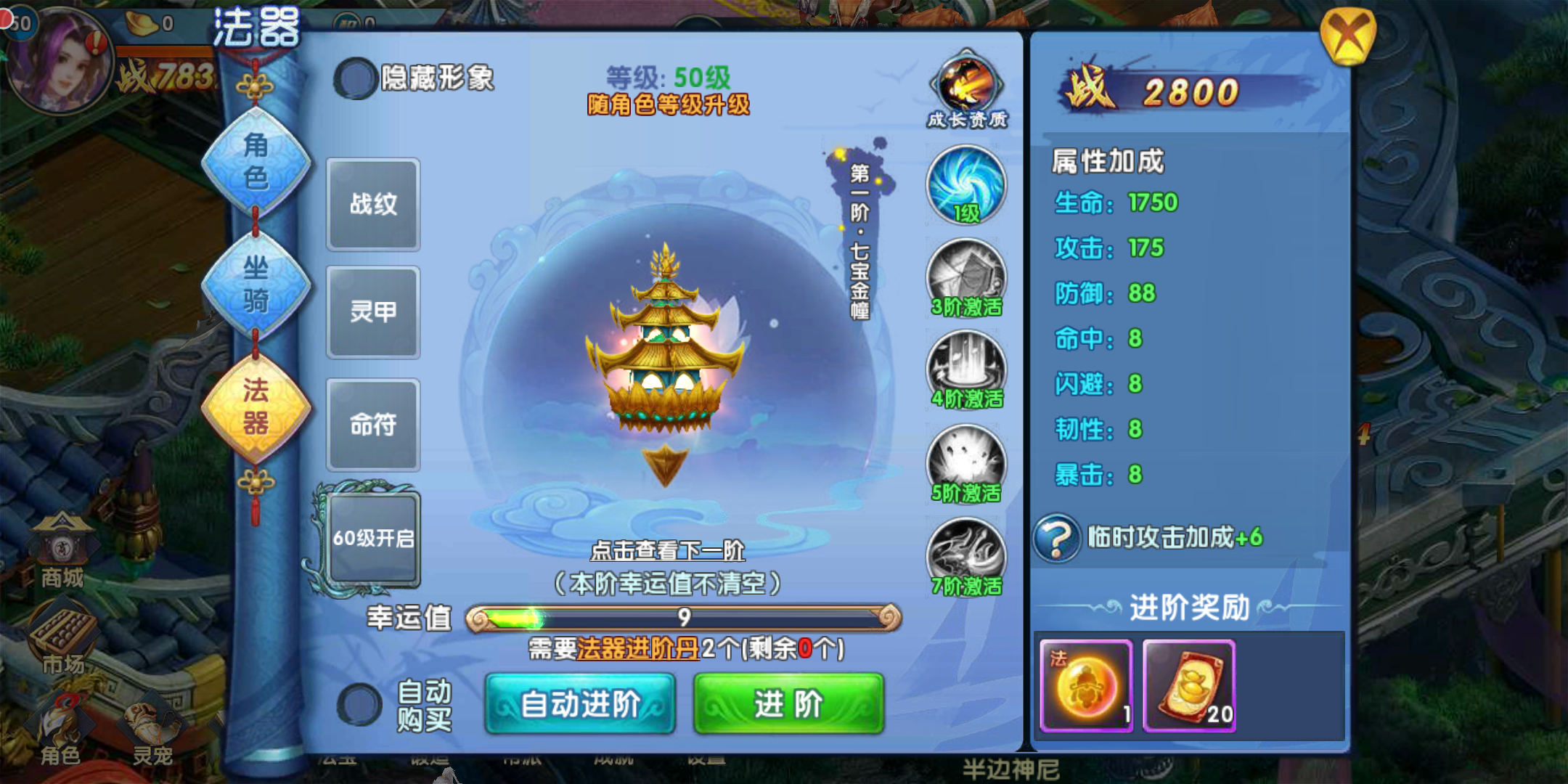 法器强化与坐骑相同,消耗相应的进阶丹进行进阶,当进阶到一定等级后幸运值将会限时情况。玩家需注意,在限时内能否进阶成功以避免不必要的消耗哦。法器与坐骑都可进行装备的穿戴,装备可为坐骑法器提升战力。