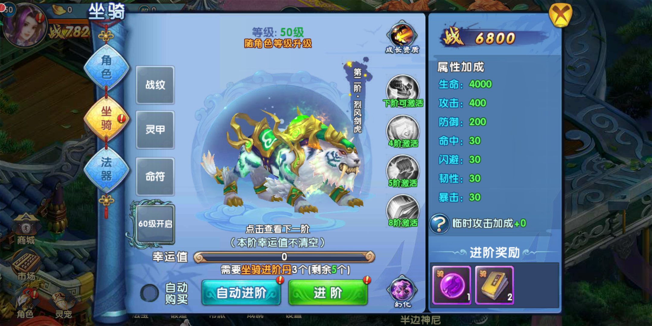 角色获得坐骑后可进行强化,消耗进阶丹增加坐骑进阶的幸运值,幸运值满则可进阶成功。进阶除属性提升外,还可获得坐骑技能书及资质丹的奖励。坐骑进阶到一定等级可自动解锁坐骑技能。坐骑还可进行幻化,激活幻化可解锁永久属性加成。
