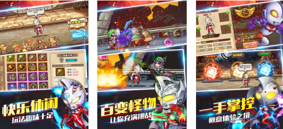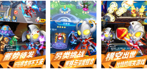 本作也是刻意呈现可爱风格的奥特曼闯关类型游戏,加入了横版闯关和塔防活动等多样的玩法,操控大头可爱的奥特曼战士与怪兽厮杀更具快感,玩家亦可组合战队一起对抗邪恶的怪兽敌人,特效展现完美还加入了杜撰的奥特曼剧情,华丽的变身效果也给人看奥特曼IP特摄剧的奇妙体验哟。
