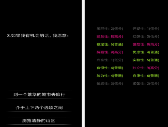 这款能进行心理以及性格测试的,让大家通过里面的一些测试后,更加了解自己。依托严谨的数据,甚至是专业的算法,如果想通过这种游戏来判断一下自己的心理,就能根据各种测试的题目做一个简单的了解,有各种各样的可能。在玩的时候,由于里面的测试题目特别的多,所以一定要耐心的阅读,然后选择正确的选项。