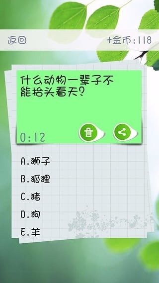 《趣味答题猜谜》每一次答题都是对自身知识的一种增长,游戏除了在题目的类型上进行了百般千举的设计之外,更是依据不同题目的特性,开创出了各有差异的答题方式,其中涵盖了数以万计的字谜,以及以动植物为主的图文答题等等,在一些特定的关卡设计中,还提供了多选项的选择题,让玩家去进行一一的判断。