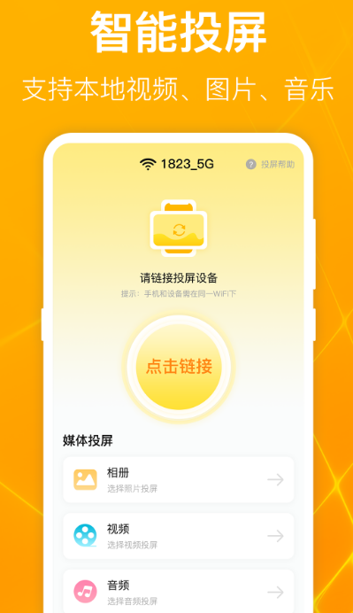 一款专注于移动端投屏体验的应用,让用户在大屏幕上享受手机中的影音资源。采用先进的无线传输技术,几秒内即可完成设备配对与内容推送,支持无限次传输视频、图片和音频文件。自动识别手机本地媒体内容,连接同一WiFi网络后即可快速搜索并选择所需文件进行投屏。投屏过程中,手机可充当遥控器,实现播放控制、音量调节等功能。