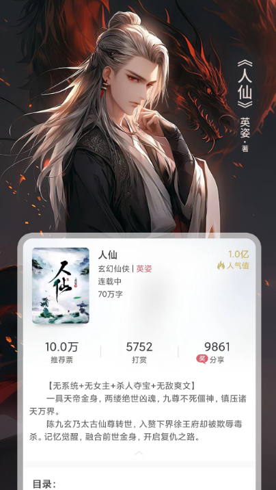 该应用当中的小说,以仙侠,玄幻,现代都市等为主,如果想要看凡人修仙传这种题材的话,可通过直接输入这款小说的名字就能从头到尾观看,也可从任意一张进行观看。除了在看书的时候,可给用户带来非常好的阅读体验,还有很多的书籍内容,专门为喜欢看书看小说的用户打造。即使不知道看什么书的情况下,也可看到每个作品的播放量以及相关的评论分享数量等。