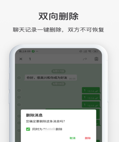私密社交软件和好友之间的聊天记录会加密,任何第三方没有办法窃听和读取,为工作生活提供私密安全的沟通环境。该软件支持众多功能,发送文字、文件、文本、图片、表情、语音、视频等。两人之间的聊天记录可双向删除,一旦一方删除双方都不能恢复,采取贴心又安全的模式,受到很多交友人士的喜爱,包含无限制文件传输,公司中的私密文件可利用该软件来传送,满足文件的安全性。
