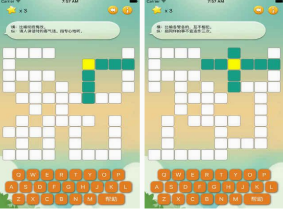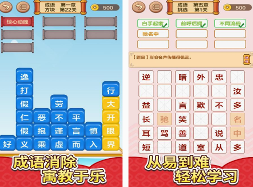 如果你想要玩成语接龙类型的游戏,这款收录了300多条,所以有很多的游戏玩家,会通过这款游戏来学习这方面的知识。玩法也是多种多样的,可通过由易到难的情况,帮助大家了解更多与成语有关的。还具有精美的画面,以及成语收藏的功能。如果你想要通关的话,需要根据里面所给出的文字正确的填写,将满足数量的成语填写完毕,就可以进入下一个关卡。