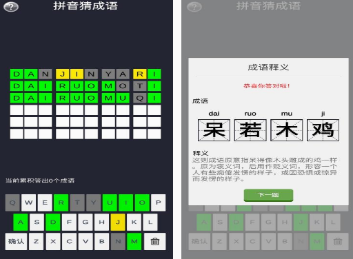 这款通过拼音首字母来猜成语的游戏,你也需要将成语填写完成,才能顺利通关,所以也是满足需求的。玩的过程中,你可在看到了文字的内容以后,利用拼音拼出来,保证每个字母所在的位置是正确的,才可以。在成语释义这方面,也能帮助大家提升这方面的见识,无论是常见的或者是不常见的,都能更好的了解,是语言学习非常好的帮手。