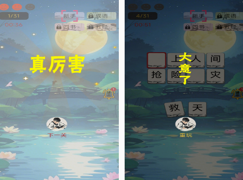 这同样是通过填写拼音首字母的方式,就能显示出各种文字的,除了涵盖四字成语,同时还有谚语以及诗词等内容。你需要在玩的过程中,仔细的观察方格的数量,如果能答对的情况下,就能过关,获得相应的金币奖励。主要的难点就是,玩家在玩的过程中有时间限制,你必须要争分夺秒,都要完成任务才可以,不然的话也会面临失败。