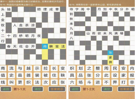 这是涵盖超多关卡的,虽然以大家常见的四字成语为主,无论是任何排列顺序的四字成语,都要填写正确才可以,不过在玩法上与常见的成语接龙有一些区别。因为它并不是说填入文字,来畅玩的,而是通过点击拼音字母首字的方式,就能显示出与众不同的文字。无论是横列或者是纵列,大家都要根据不同的内容完成任务。