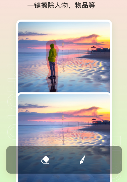 不管是做朋友圈九宫格还是推广宣传图都好用。想做海报也不用愁,拖拽就能添加或替换文字,操作零门槛。最实用的是智能消除笔,涂抹几下就能去掉画面里的多余路人、划痕。