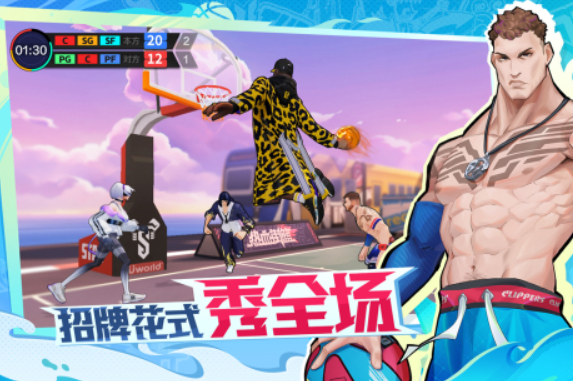 热血街篮聚焦街头篮球文化,采用鲜明卡通美术风格,营造出轻松活跃的游戏氛围。游戏内设多种主题球场,如城市广场、沙滩区域和屋顶场地,每个场景都有独特视觉元素——高楼倒影、椰树遮阳伞、远处天际线等,并伴随动态效果如阳光斑驳、沙尘飞扬,增强代入感。