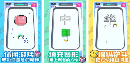 各种精美的图案应有尽有。玩法特别简单,在其中会有各种方块,而大家只需用手指推动方块就可以将空白的场景全部填满。每次填满之后就可以呈现出色彩缤纷的色彩,以达到数百多个不同的挑战关卡,比如有的关卡中会看到特别美味的水果,也有的关卡中会看到很多汉字。