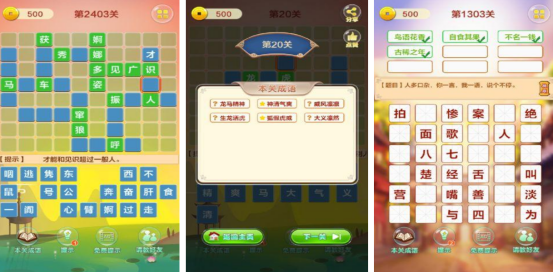 海量关卡内容等大家来闯关,在每个关卡开始之后都会给出不同的提示,比如横向表示的寓意,或者纵向表示的寓意等等。大家根据这些提示从下方寻找到正确的汉字填入进去,只要输入的答案正确之后就会显示在方格中。已设立1400多个不同的关卡,每个关卡都不会重复,都会带来创新式的游戏体验。