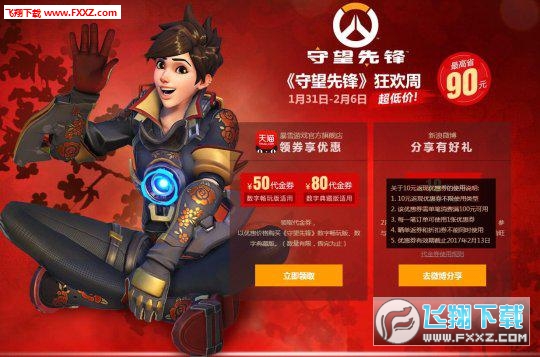 用户可以在暴雪旗舰店《守望先锋》狂欢周页面领取代金券,金额分别是50元和80元,其中50元适用于售价198元的数字畅玩版,80元适用于328元的数字典藏版。除此之外,还可以通过分享本次活动订单至新浪微博,获得10元代金券。