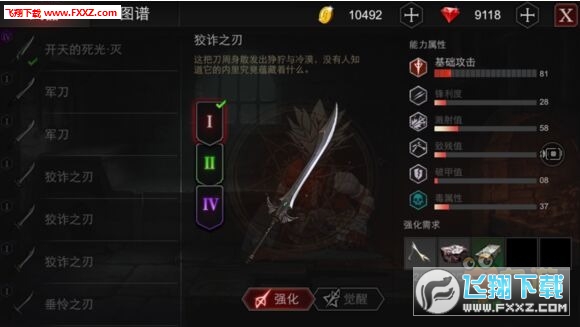 通关第二个副本—祭祀禁地后,会接到一个武器锻造的新手任务,完成后会得到一把军刀,这把军刀各项属性比垂怜之刃好一些,是游戏初期的主要武器,往后几个关卡都要靠它。