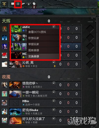 第二步,我们可以在左上角打开玩家列表,在这里面可以看到,所有玩家的英雄列表