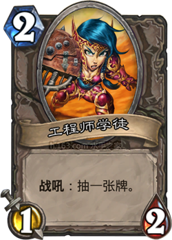工程师学徒:2费1-1,战吼:抽一张牌(由于是基本卡,所以这个随从是最基本的模型,衍生卡都会参照此模型来)