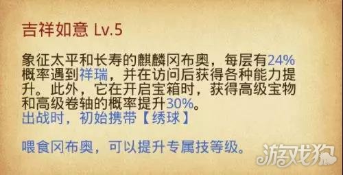 技能:吉祥如意。象征太平和长寿的麒麟冈布奥,每层有8~24%概率遇到祥瑞,并在访问后获得各种能力提升。此外,它在开启宝箱时,获得高级宝物和高级卷轴的概率提升6~30%。 出战时,初始携带【绣球】。
