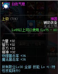 左槽能增加技能等级的装备还是有不少,如果没有好的史诗道具可以直接去刷遗忘之地,1个星期左右就能搜集到2000个七彩转移晶石,然后可以在乔安· 费雷诺的商店里面兑换白色气息,属性是所有职业30级技能+1。