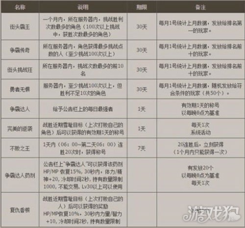 为了街头争霸的公平和自愿性,在邀请对方进行争霸赛的同时,首先要征得对方的同意才能进行开始,对战的地点仅在城镇之中,而且只有三十级以上的玩家才可以进行挑战,为了公平性,对于装备强化和人偶一系列的东西不得使用,进行挑战的玩家次数越多,玩家的头像就会有一定的改变,次数越多颜色会变红色。