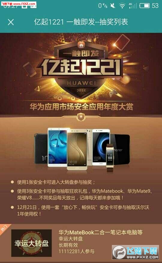 在百度下载华为商城市场,下载完注册华为账号,注册后在首页的一触即发的活动点进去,然后点幸运转盘抽奖,抽6次自动送