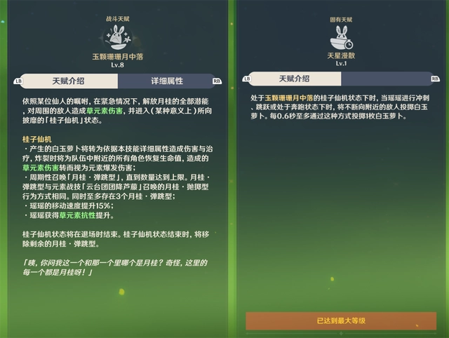 元素爆发方面,使用大招后,萝卜的伤害与治疗量提升;此时造成的草元素伤害视为元素爆发伤害。周期性召唤特殊型号的“月桂·弹跳型”,直到数量上限。初始数量上限为三个。此外,瑶瑶移动速度增加15%,草元素抗性增加。