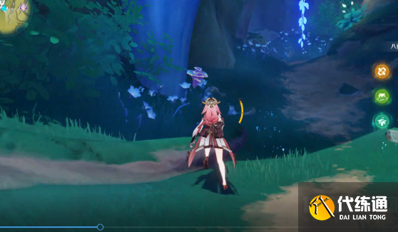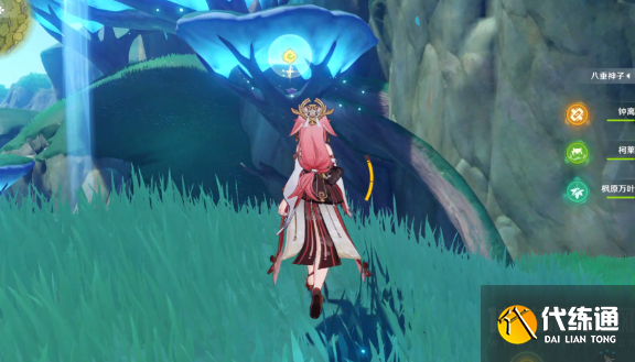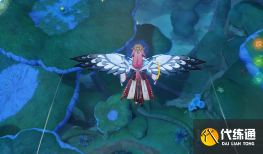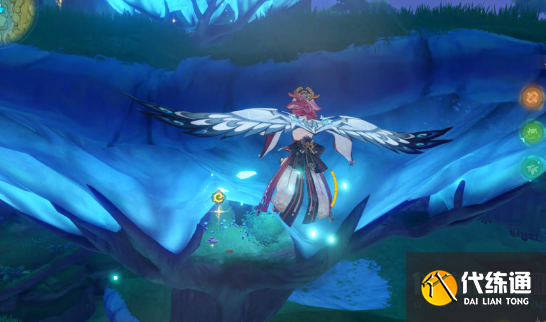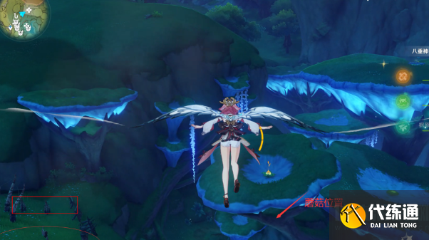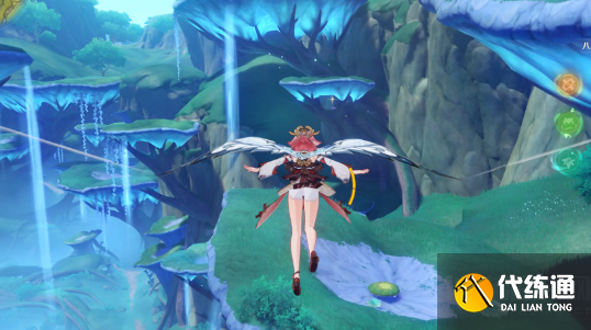 接着我们看到地图右边的风场,走过去,芜湖起飞~(风场开启方式顺便一提,打败附近的史莱姆,用雷元素攻击会移动的那个三相种子,看到中间的花就可以启动风场哦)