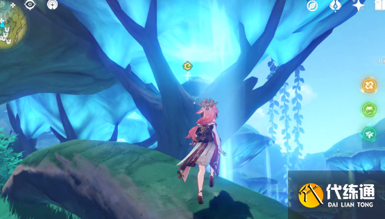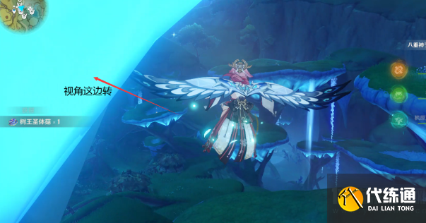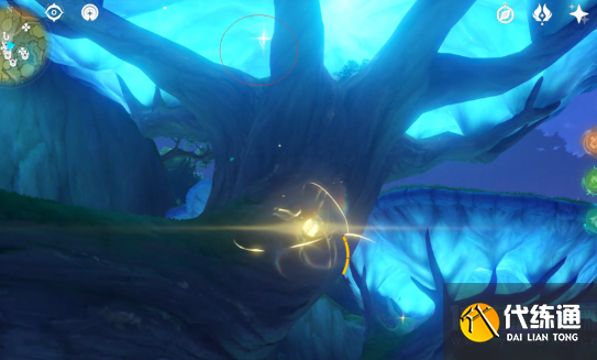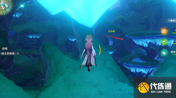 之后我们看到地图左边的树根,向上爬,看到蕈兽就到达了位置,此时我们抬头看到地图上方的四叶印,进行位移,收集到空中第一个蘑菇