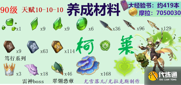 柯莱突破材料如图所示,其拉满需要168朵「树王圣体菇」、46个翠翎恐蕈掉落的「蕈王钩喙」、36支射手丘丘人掉落的「历战的箭簇」等突破材料。