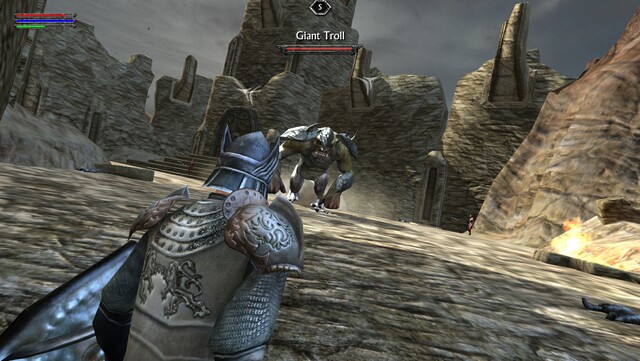 来到城堡门前要干掉一个巨兽,周围有弓箭手先上去干掉,如果你想省事就在周围平台带着,队友一会就砍死了。