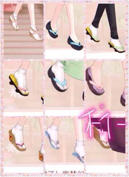2.鞋袜搭配可以自由组合,但是要遵循一下原则:a.高跟鞋,熊拖鞋,兔子拖鞋,等除木屐以外的鞋跟足袋配是最安全的标配。b.木屐可以配所有标配里面的袜子,安全性高。c.黑色船袜跟平底木屐搭配最安全,其次跟坡跟有花纹的木屐,其他都危险,遇到可以退了。d.楼主所说的木屐就是一个面板加两边夹角的,雨天游戏也算