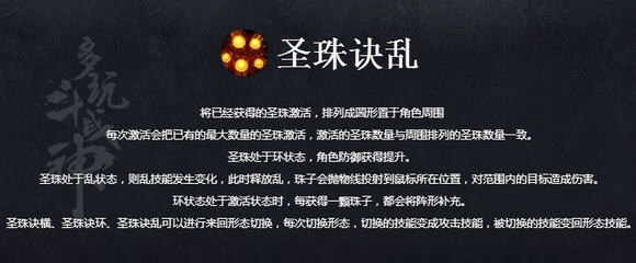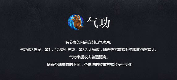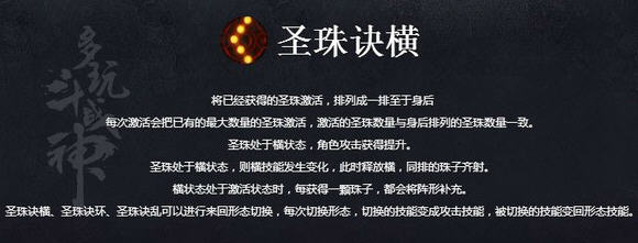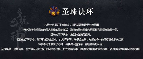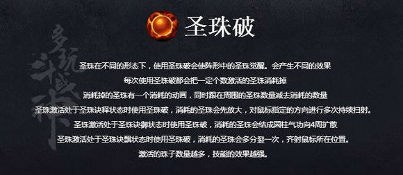 以圣珠作为介质,通过圣珠进行阵形排列作为主要攻击手段,圣珠阵形分为横,环,乱三种形态,这三种形态可以应对各种不同的战斗状况。横,可以很好的攻击前方目标,对前方目标造成巨大伤害。环,可以很好的保护自身,对于近身的敌人进行反击。乱,可以追踪敌人,使目标无处可逃。