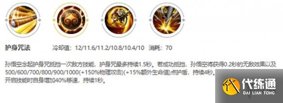 1、技能描述为孙悟空念起护身咒抵挡一次敌方技能,护身咒最多持续1.5秒。