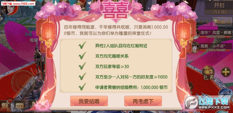 异性双方等级到达30级且情义值大于11000,即可组队前往开封红娘处申请结婚。