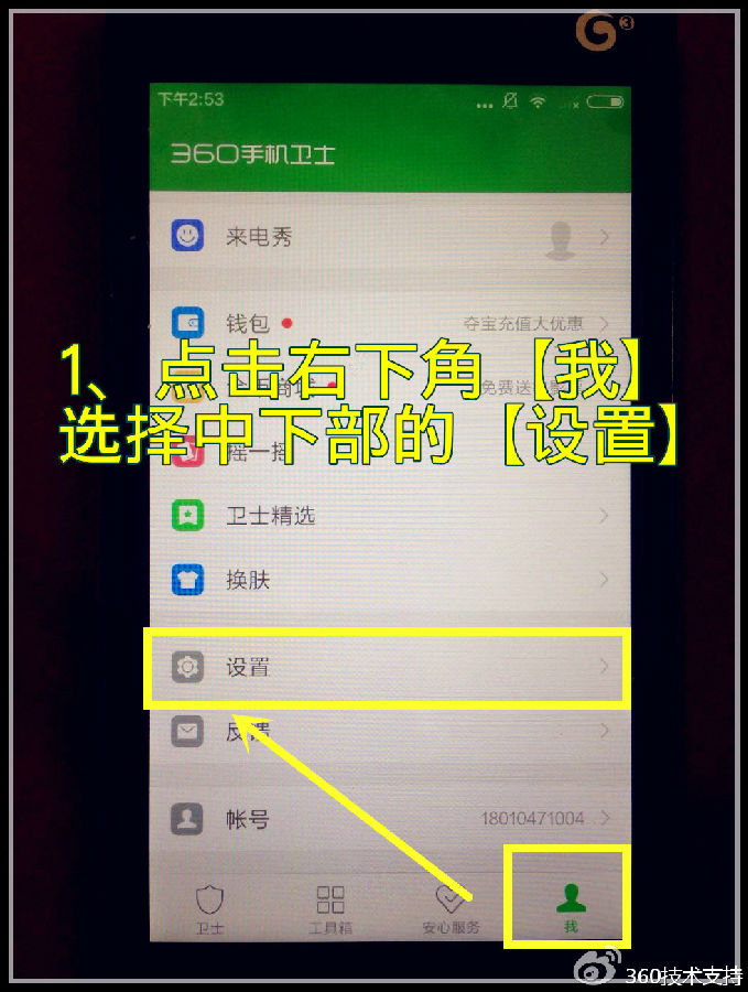 打开360手机卫士,点击右下角的【我】,选择位于屏幕中下部的【设置】功能(操作示意如下图);