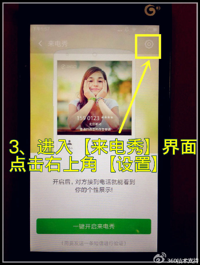 进入【来电秀】界面后,点击位于屏幕右上角的【设置】Ps:小齿轮形状(操作示意如下图);