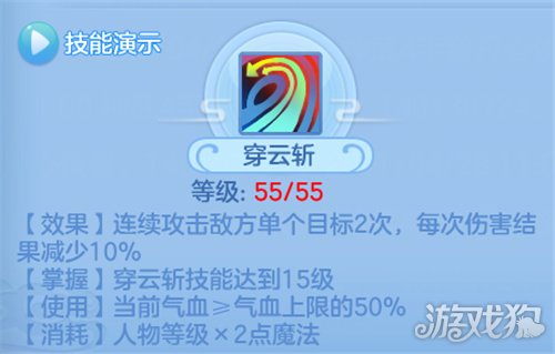 穿云斩是天宫的主要输出技能,技能使用不需要休息,持续输出能力强,提高了针对性,不过需要注意血线问题,血气低于50%就会被罚站。