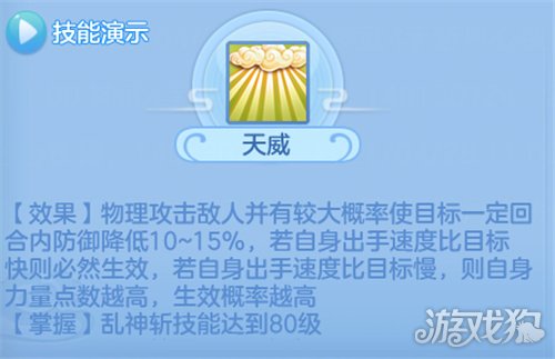 天威需要在技能80级的时候才能使用,自带破防效果,对高防御目标也能造成可观的伤害。