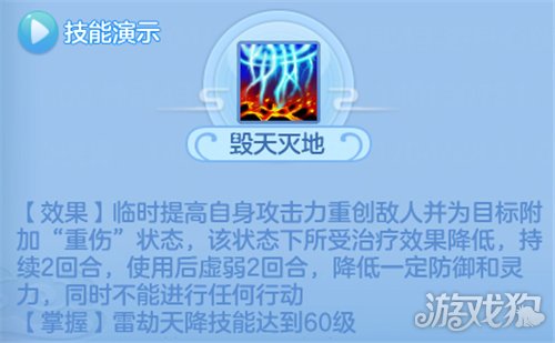 毁天灭地是天宫高伤害爆发技能,使用后会虚弱2回合,因为释放前提还需要五点愤怒,所以在pk的时候使用的比较少,在pve中还是一个值得重视的技能。