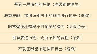 洞察:普通物理攻击时,临时提升“目标物理防御-目标物理伤害”的物理伤害,最少附加1点(对怪物则最少附加自身等级*2点),最多附加自身等级*4点。