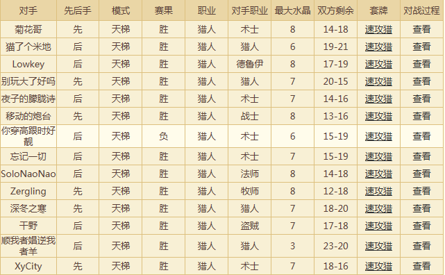 总结一下,这套牌有以下几个特点:①速度很快,一般在10费之前就能解决,能在天梯中迅速上分;②对阵术士、萨满、法师有绝对优势对阵其他职业也有很高的胜率,有回复职业略疲软③相对后期卡组还是容易上手,熟练之后胜率惊;④无比的低廉,血法师如果替代成战利品相当于蓝白套,即使是组不出动物园的用户大概也能组出来这套牌。总之这套速攻猎绝对拥有冲击传说的实力,可以为削弱后的猎人正名。