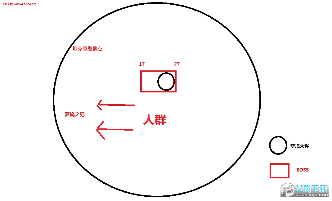 BOSS周期性在脚下拉一坨屎,要在BOSS拉满全场之前干掉,所以尽量让圈子重叠,增加场地利用率